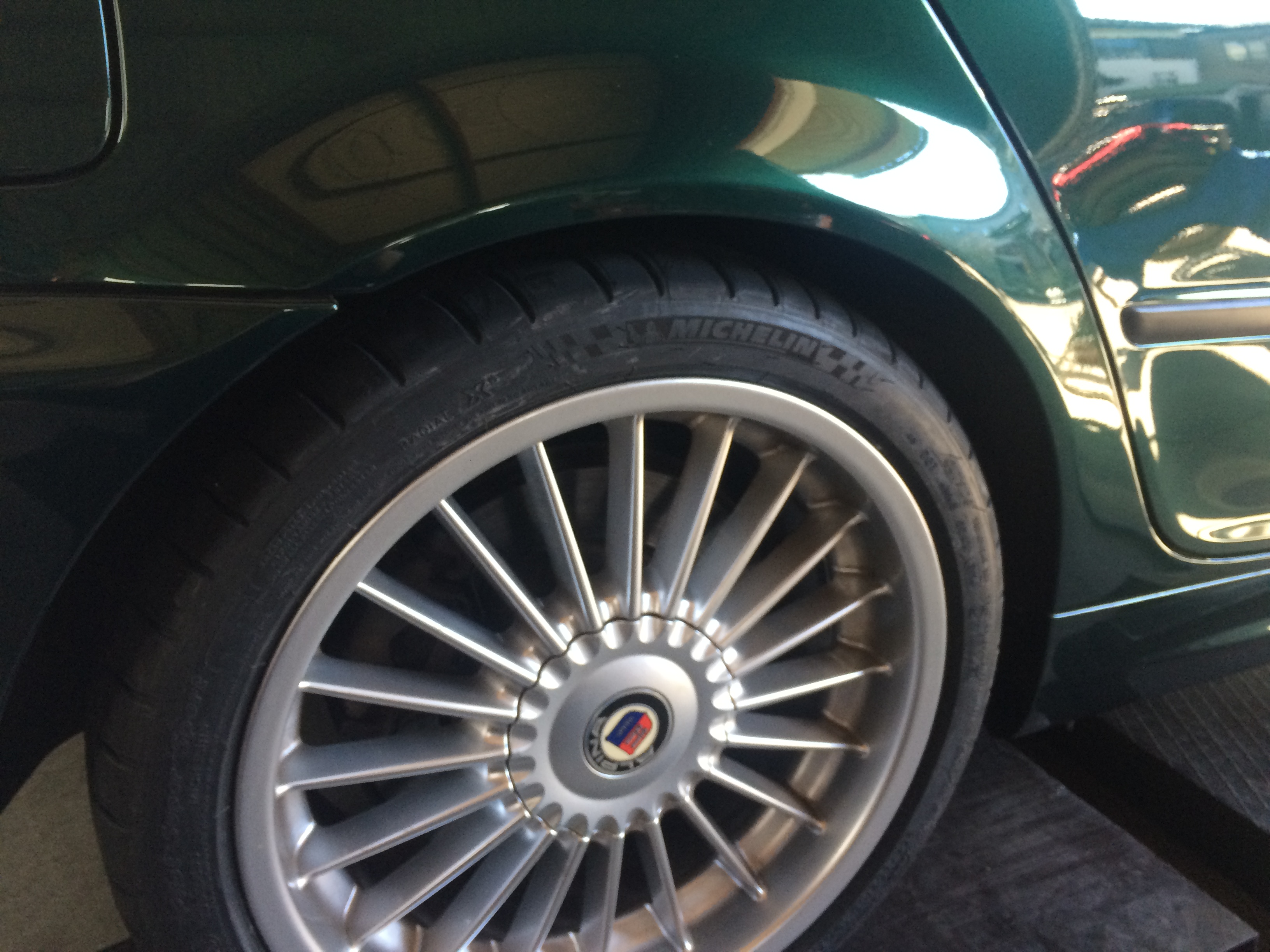 E46 ALPINA B3に、ミシュラン パイロットスーパースポーツ 225/40ZR18 (92Y) XL、255/35ZR18 (94Y) XLを装着しました。M様いつもありがとうございます。アルピナグリーンというのでしょうか?渋くてかっこいいですねぇ。それにこちらは6MTという乗ったら楽しそうなおクルマでした。
